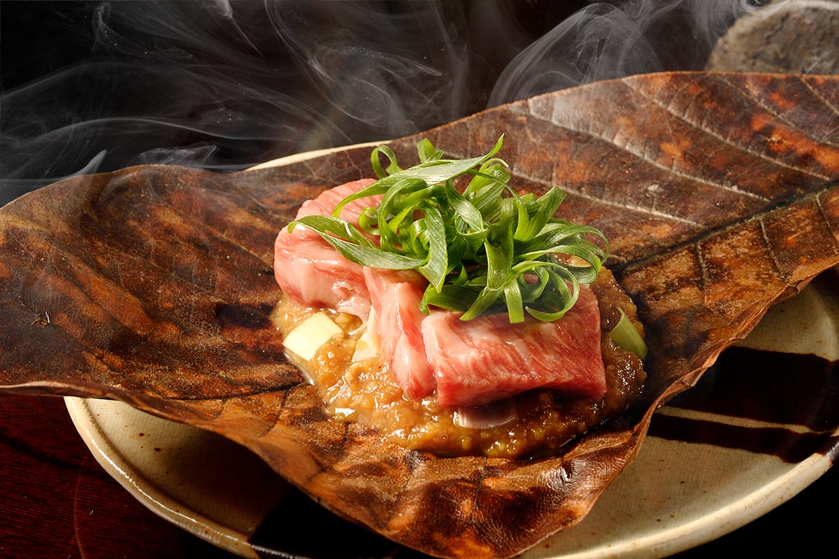 朴葉の上で香ばしく燻された味噌をお肉に絡めていただく伝統の味わいを、